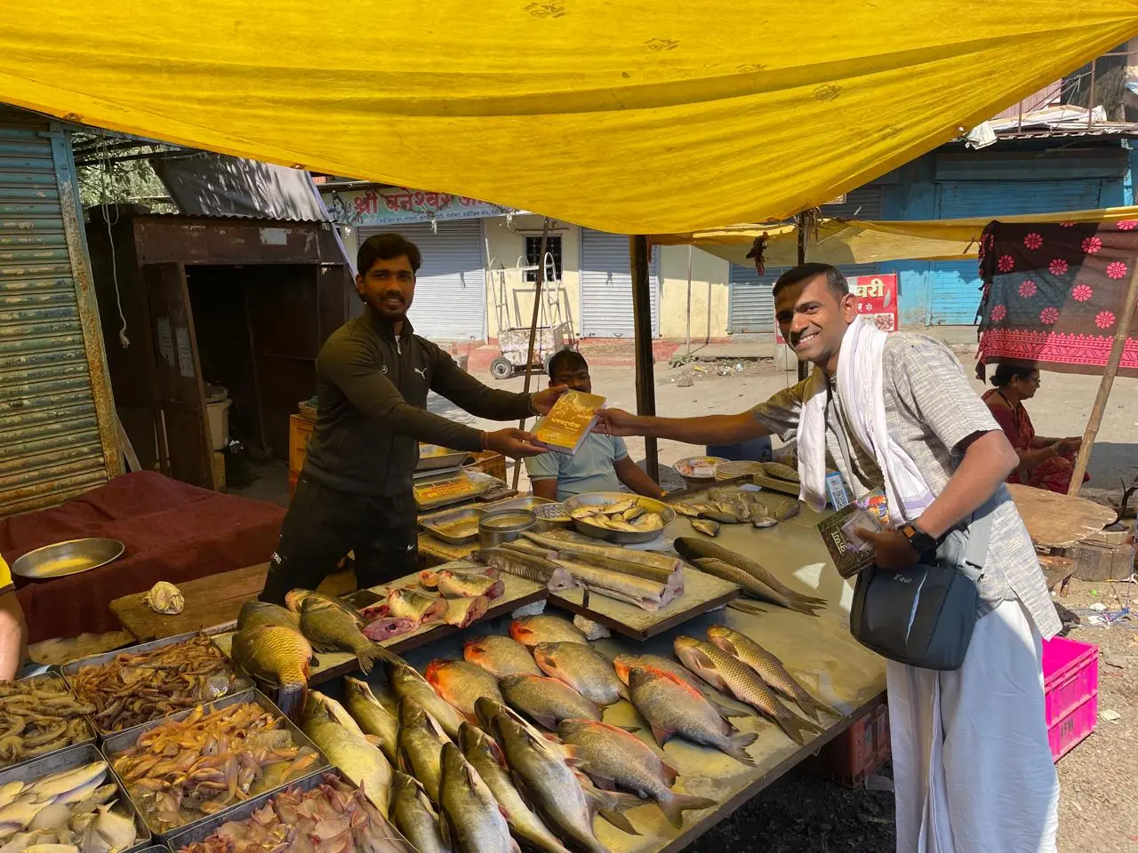 During a visit to the Baneshwar Temple in Nasrapur village, volunteers observed a relatively low turnout. In response, they chose to broaden their outreach by distributing spiritual books throughout the village. The team parked their vehicles along the roadside near a row of fishermen’s stalls and began visiting homes and shops to share the literature.
